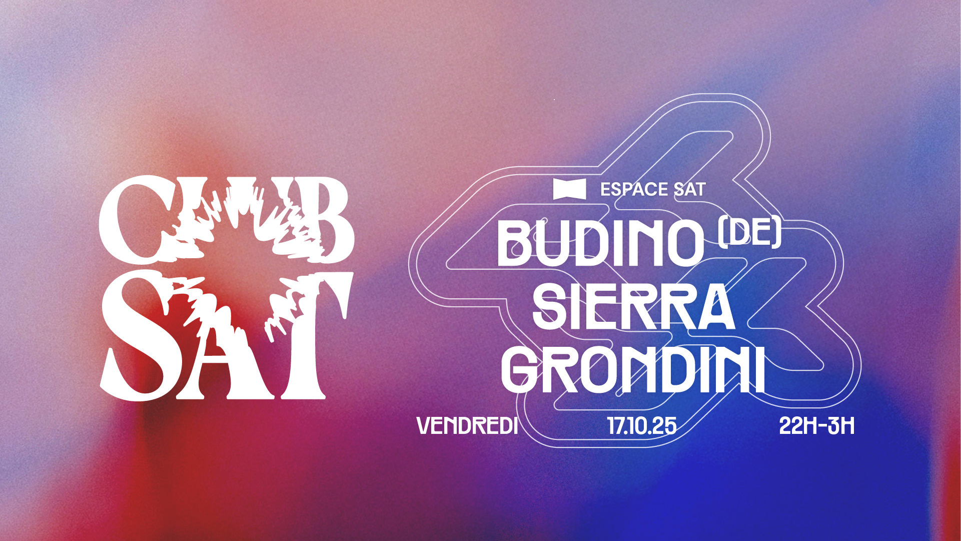 A Club SAT blending italo, house and techno, featuring internationally renowned and respected figure Budino, alongside two essential DJs from the Montreal scene: Sierra and Grondini.