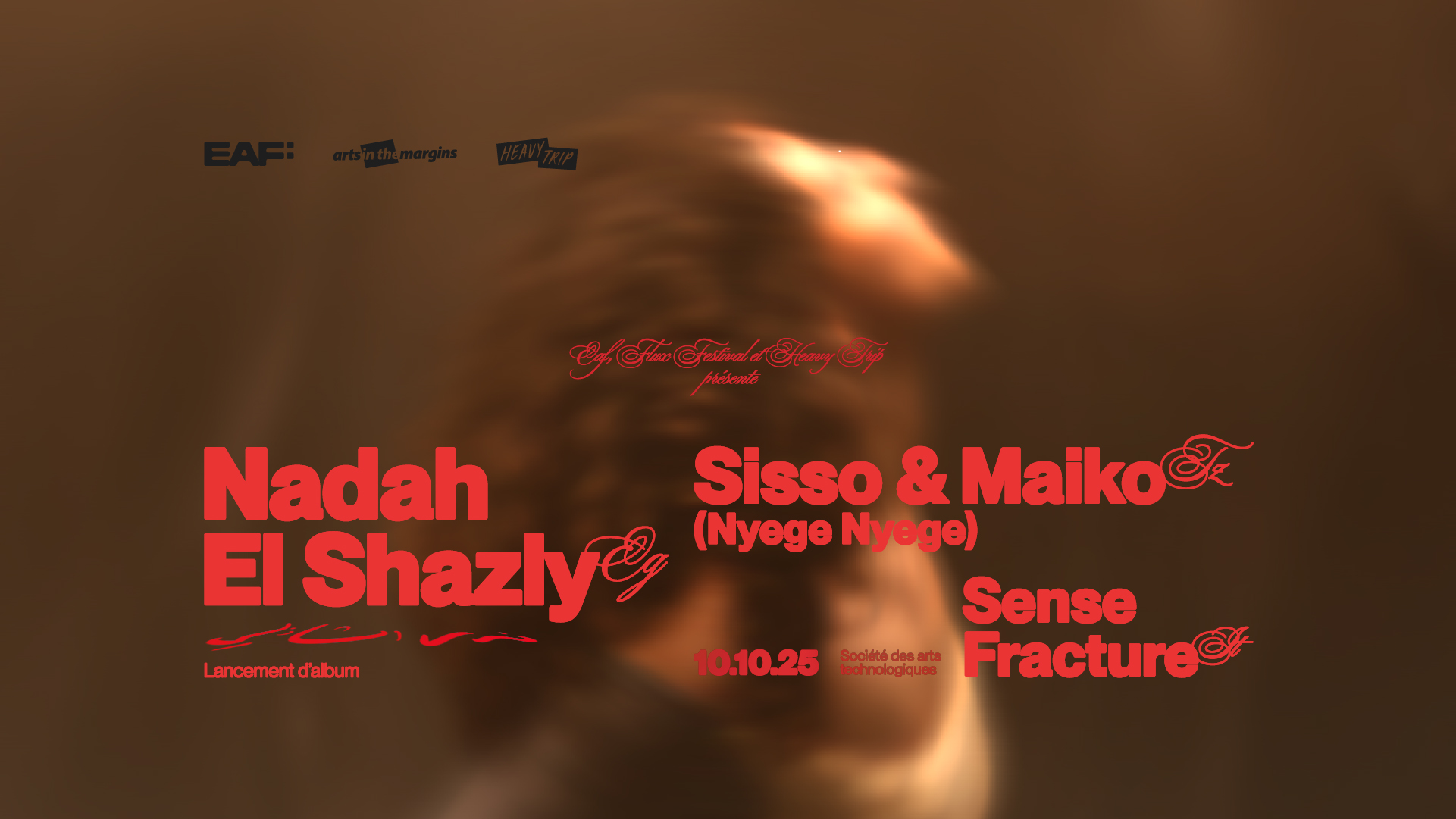 EAF, Flux Festival, Heavy Trip, and the SAT join forces for the Montreal launch of Nadah El Shazly’s new album, ندى الشاذلي (Laini Tani), alongside Nyege Nyege’s Sisso & Maiko and Milan’s Sense Fracture.