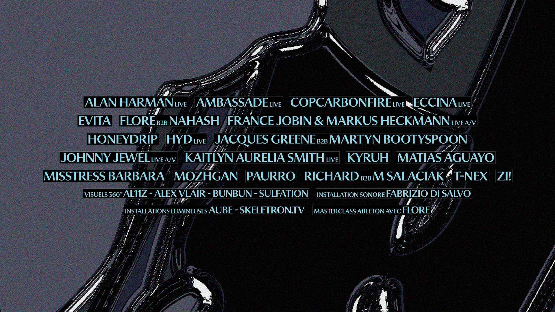 Kaitlyn Aurelia Smith (live), Flore b2b Nahash, Hyd (live), Honeydrip, t-nex, Jacques Greene b2b Martyn Bootyspoon, Mozhgan, France Jobin & Markus Heckmann (live A/V), Alan Harman, copcarbonfire, Richard b2b M Salaciak