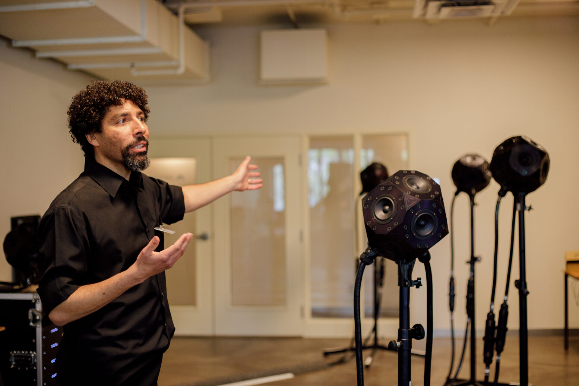 Notre nouveau studio de son, composé de 97 haut-parleurs Meyer Sound MM-4XP, offre un dispositif modulaire de diffusion allocentrique, permettant de vivre pleinement l’expérience, peu importe où l’on se trouve dans l’espace.