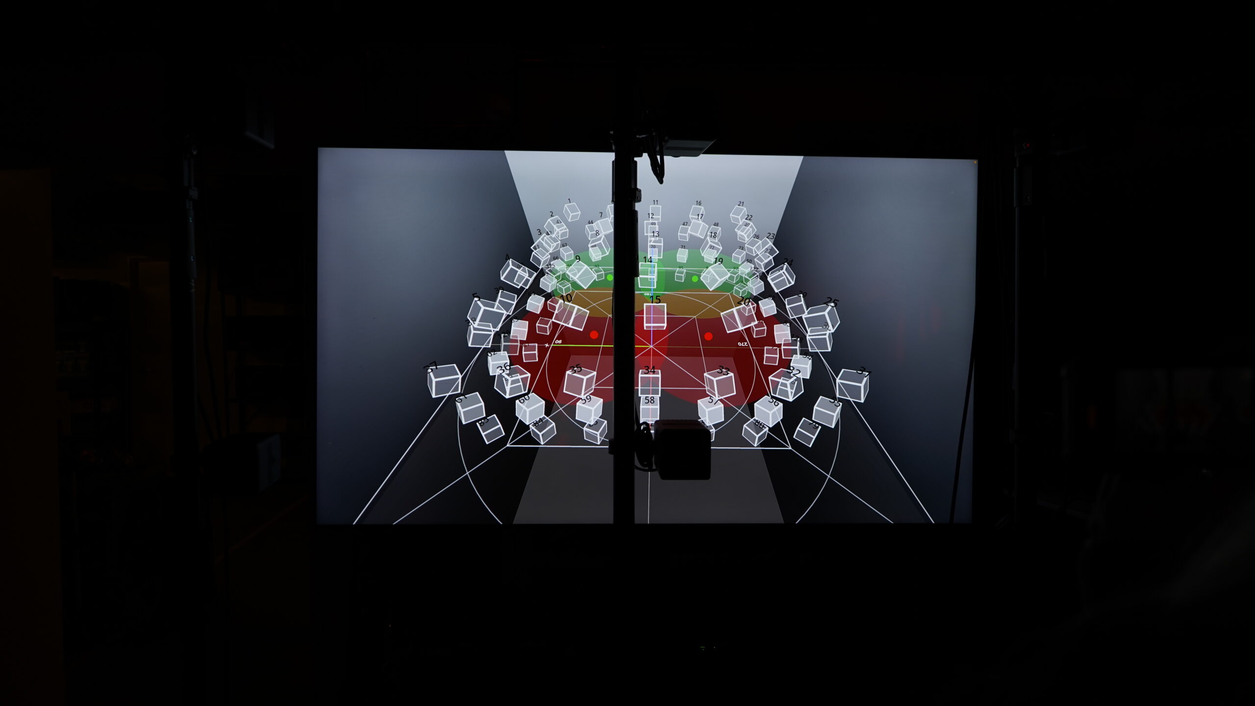 Conçu comme un simulateur d’environnement acoustique, le studio de son de la SAT offre un dispositif modulaire de diffusion allocentrique, qui n’impose ni orientation, ni position corporelle d’écoute dominante (sweetspot). Il s’adapte donc à une diversité de besoins :